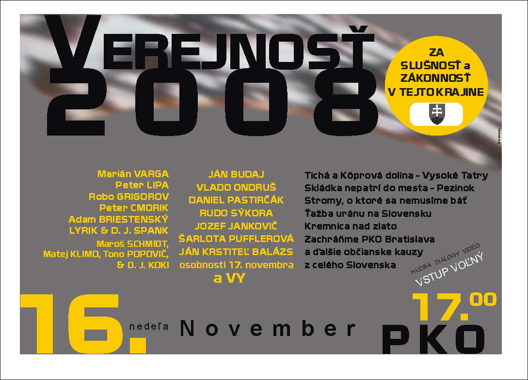 Príďte na spoločné stretnutie hudobníkov, osobností 17. novembra a občianskych aktivistov a aktivistiek z celého Slovenska s názvom VEREJNOSŤ 08 – za slušnosť a zákonnosť v tejto krajine.